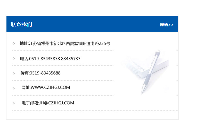 地址:常州市新北區(qū)友邦商務(wù)大廈1幢16、17層  電話:0519-85101652  傳真:0519-85112595  郵編:213022  網(wǎng)址:www_cz-jiayue_cn.woyaogegege.com  郵箱:xiajifengaa@163.com